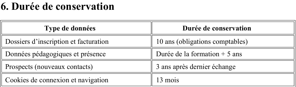 • Sous-traitants : hébergeur, plateforme e-learning, prestataires de paiement